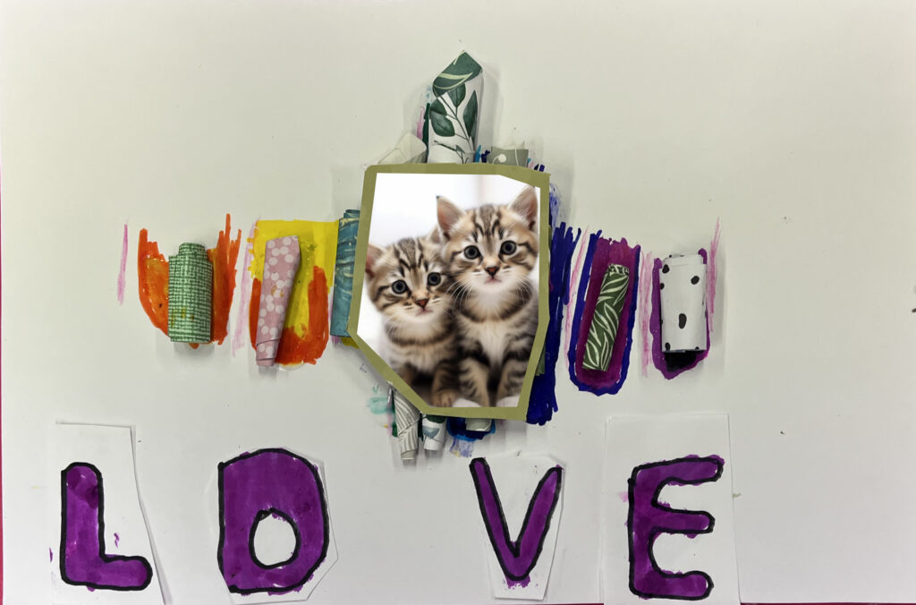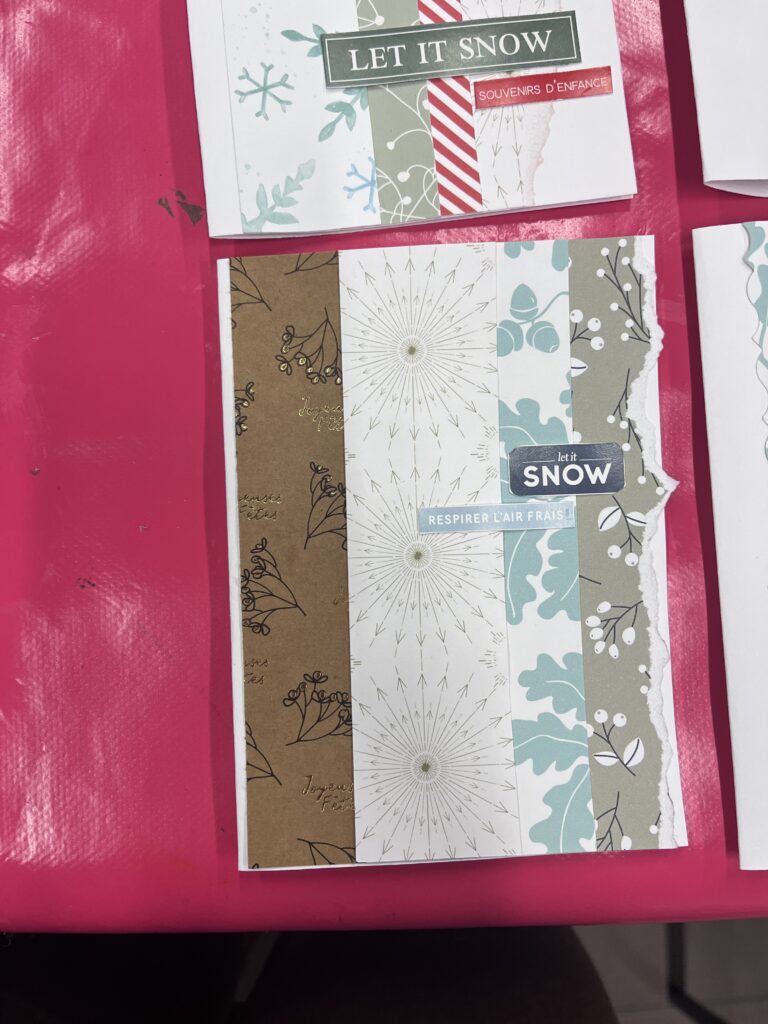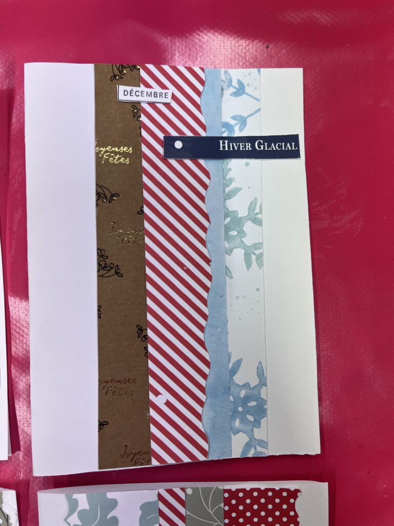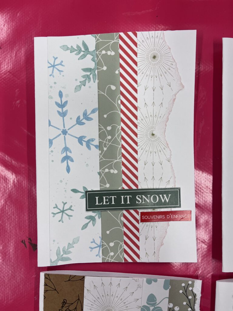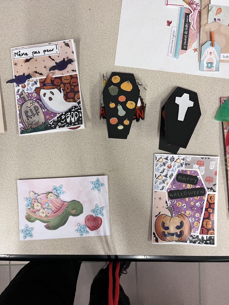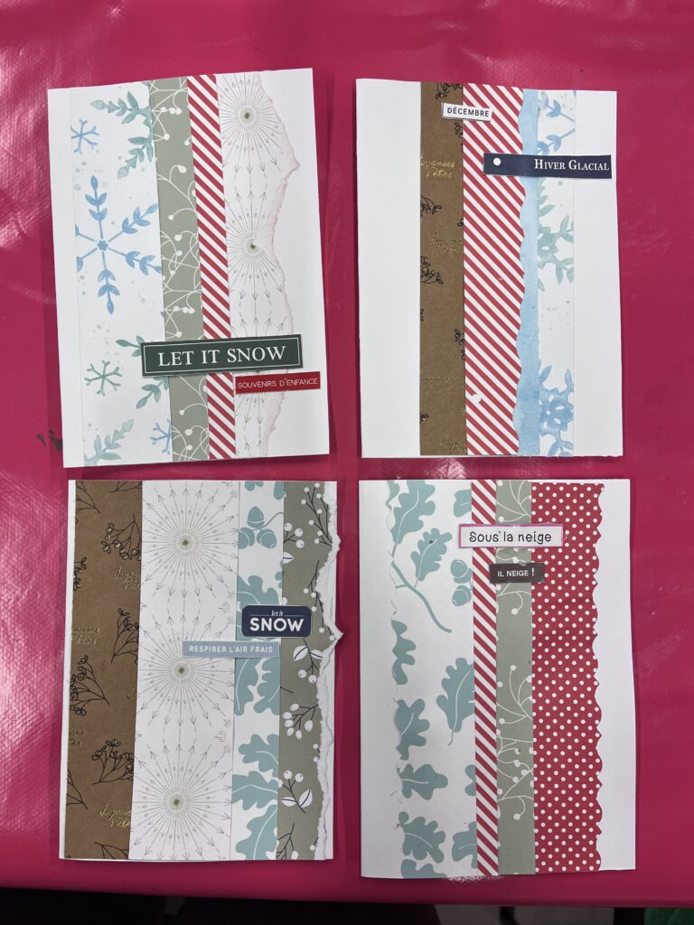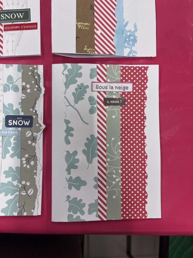 Nous créons ensemble à partir de peu, avec des dons de matériel généreusement offerts par les habitants ou des éléments de récupération. Papiers, rubans, boutons, cartons, images découpées, etc. : tout est bon pour créer ! Ces contraintes matérielles nous poussent à faire preuve d’inventivité, et les résultats sont toujours pleins de charme et d’émotion.