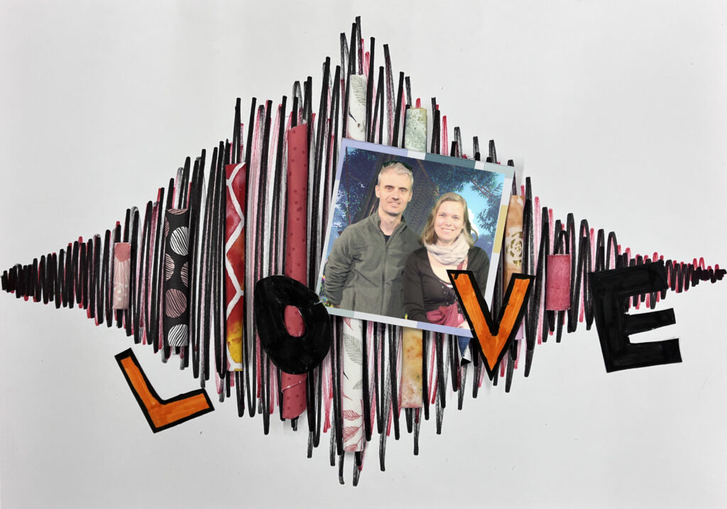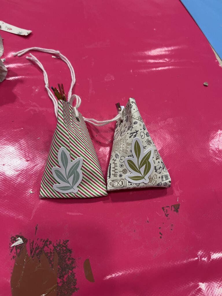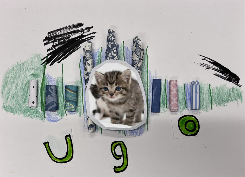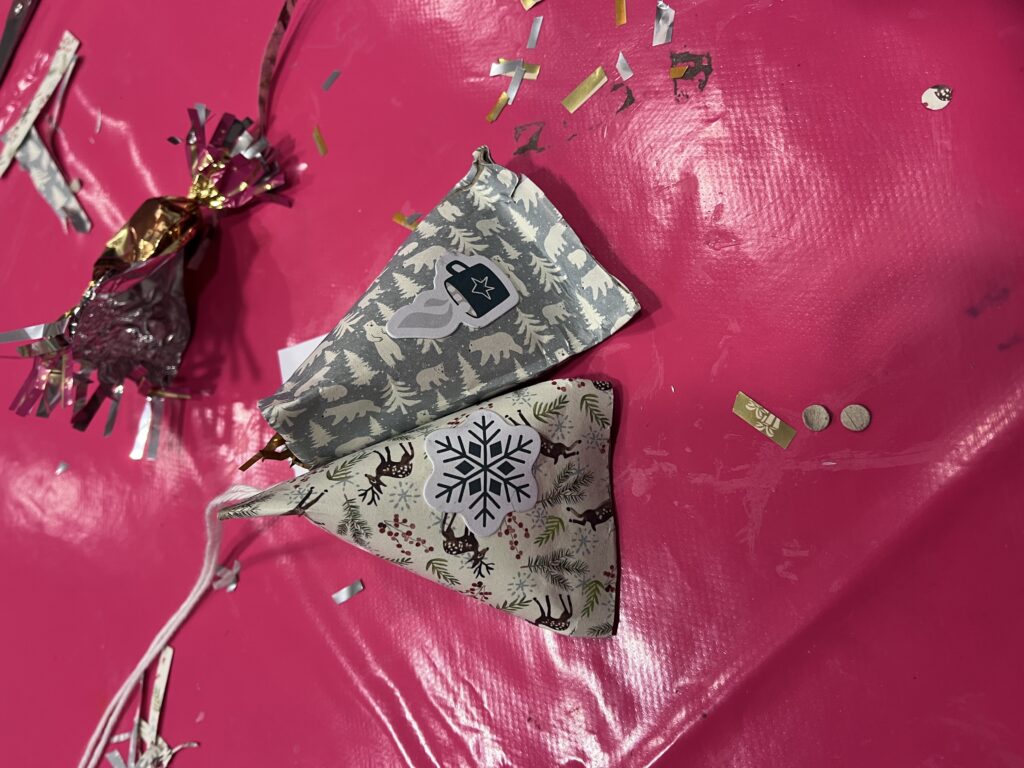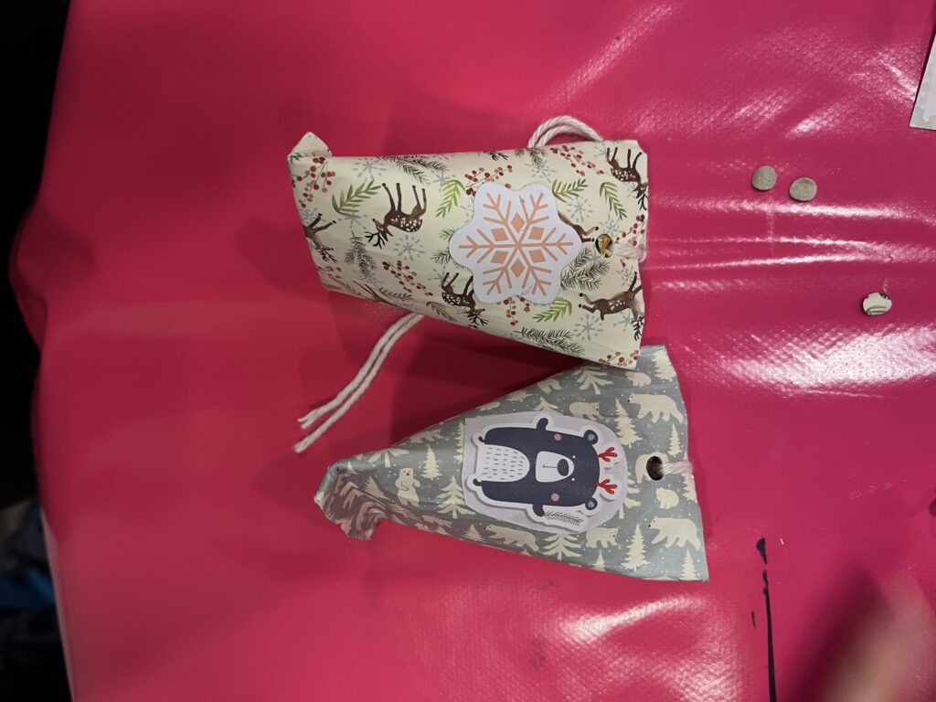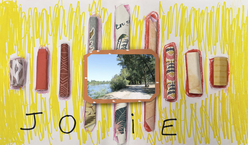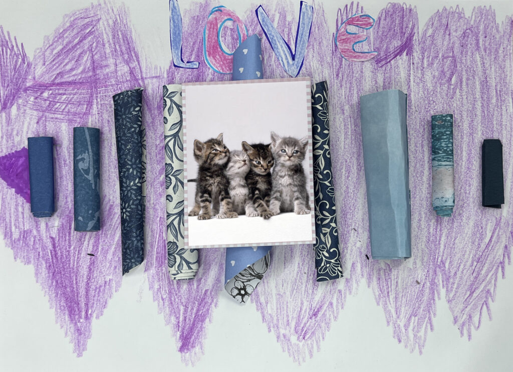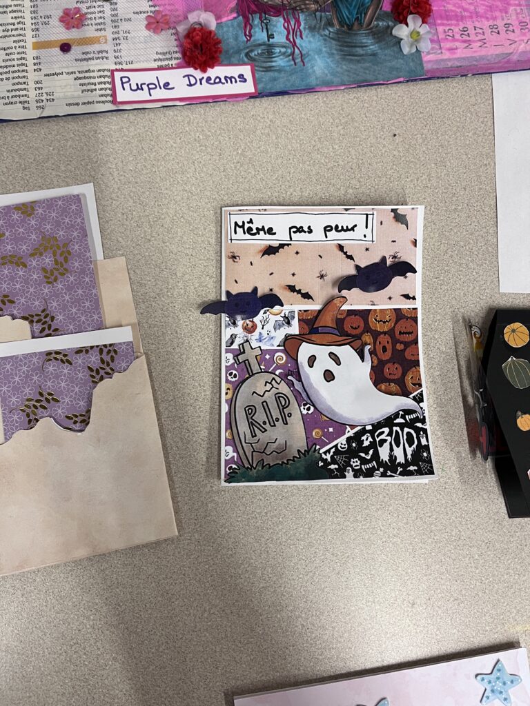 Nous créons ensemble à partir de peu, avec des dons de matériel généreusement offerts par les habitants ou des éléments de récupération. Papiers, rubans, boutons, cartons, images découpées, etc. : tout est bon pour créer ! Ces contraintes matérielles nous poussent à faire preuve d’inventivité, et les résultats sont toujours pleins de charme et d’émotion.