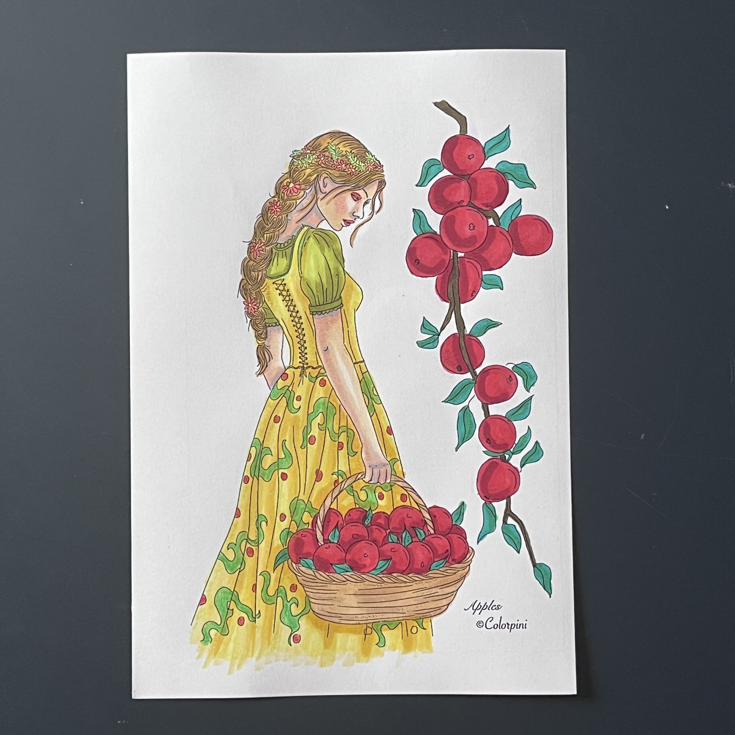 🎨 Un design original : dessin de Colorpini, une femme avec un panier de pommes, feutres à alcool et stylos gel.