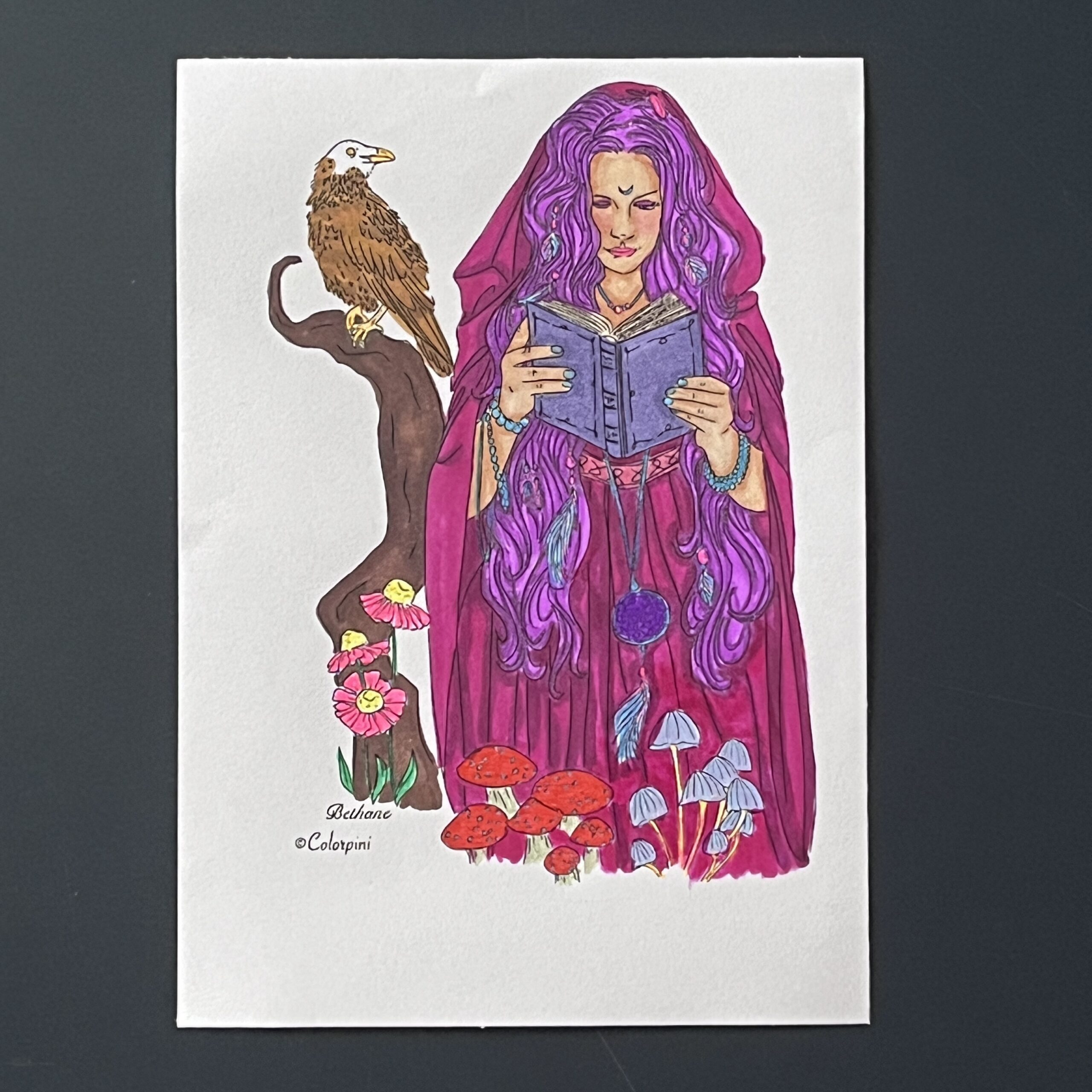 🎨 Un design original : dessin de Colorpini, une sorcière lisant un livre avec un aigle, feutres à alcool et stylos gel.
