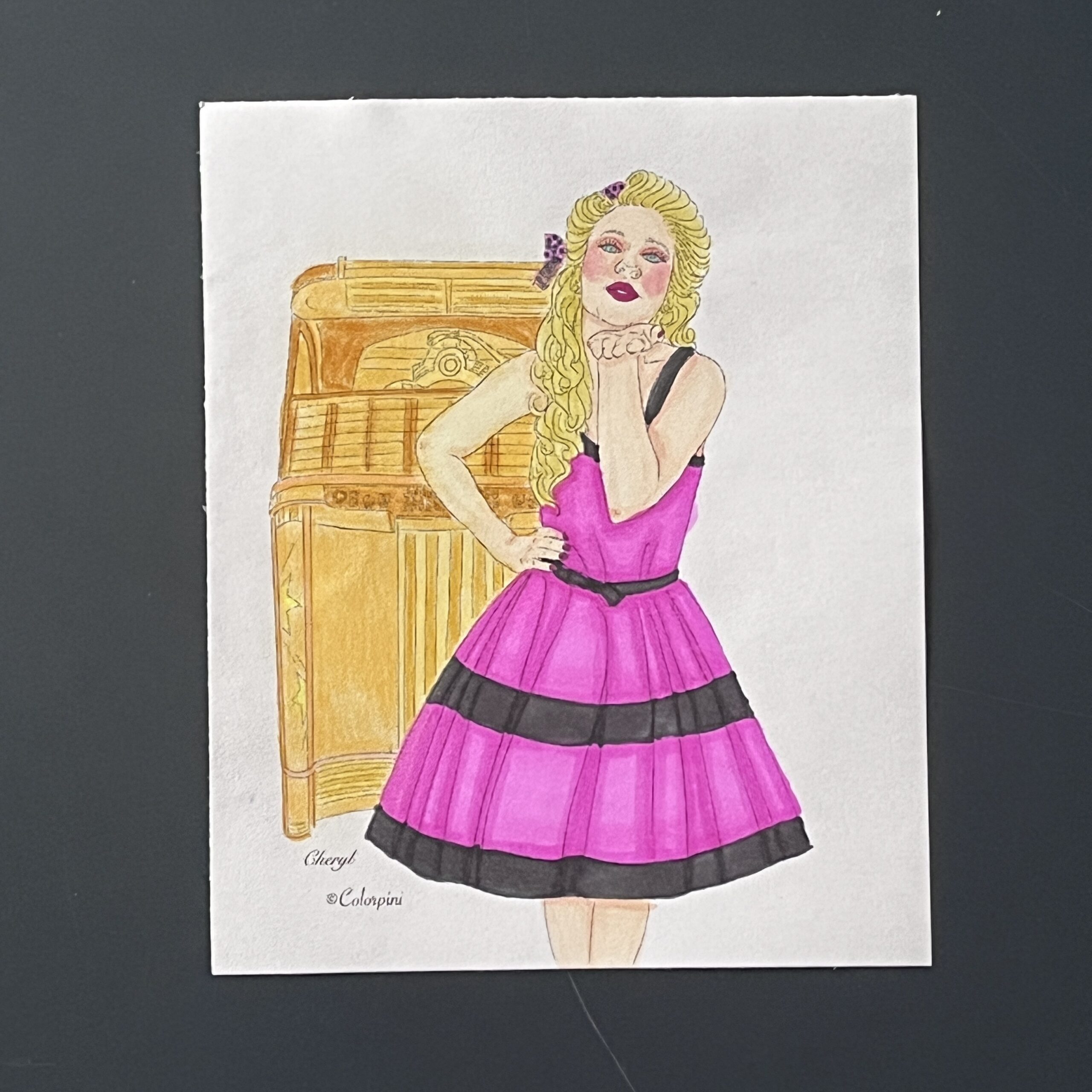 🎨 Un design original : dessin de Colorpini, une femme des années 50 devant un jukebox, feutres à alcool et crayons de couleur.