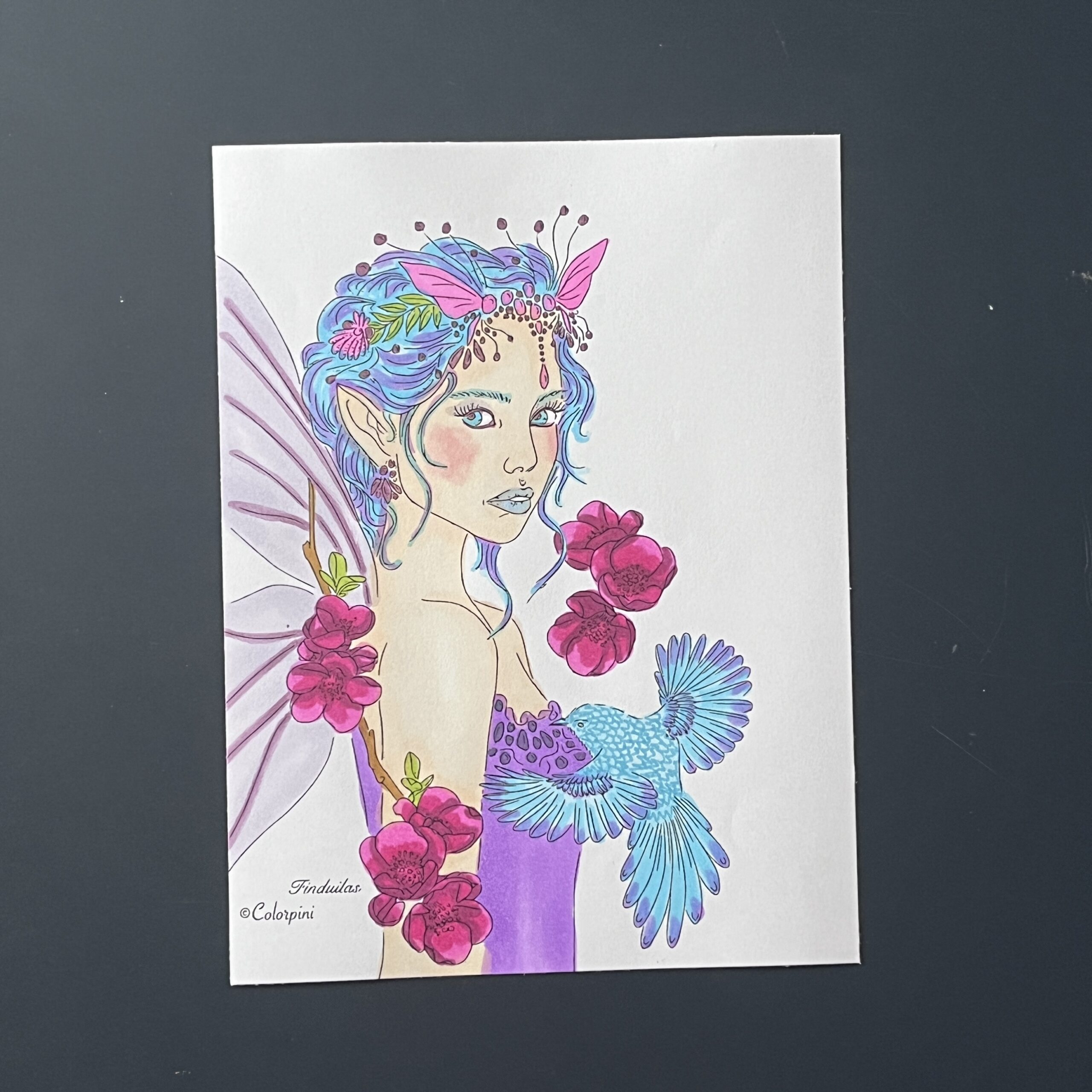 🎨 Un design original : dessin de Colorpini, une fée avec un oiseau, feutres à alcool et feutres pailletés.