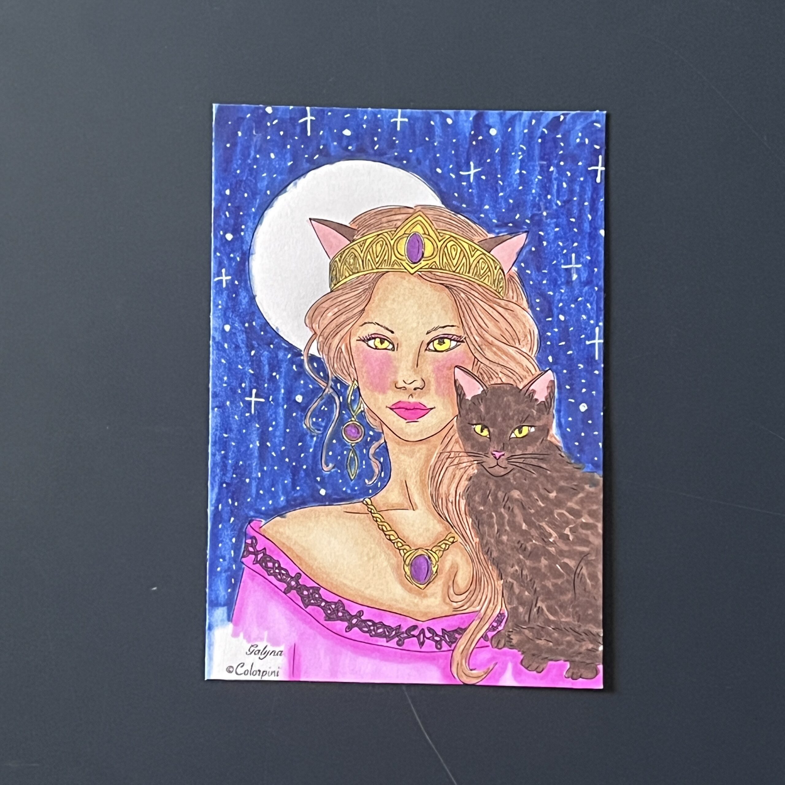 🎨 Un design original : dessin de Colorpini, le portrait d’une femme chat et son félin, feutres à alcool et stylos gel.