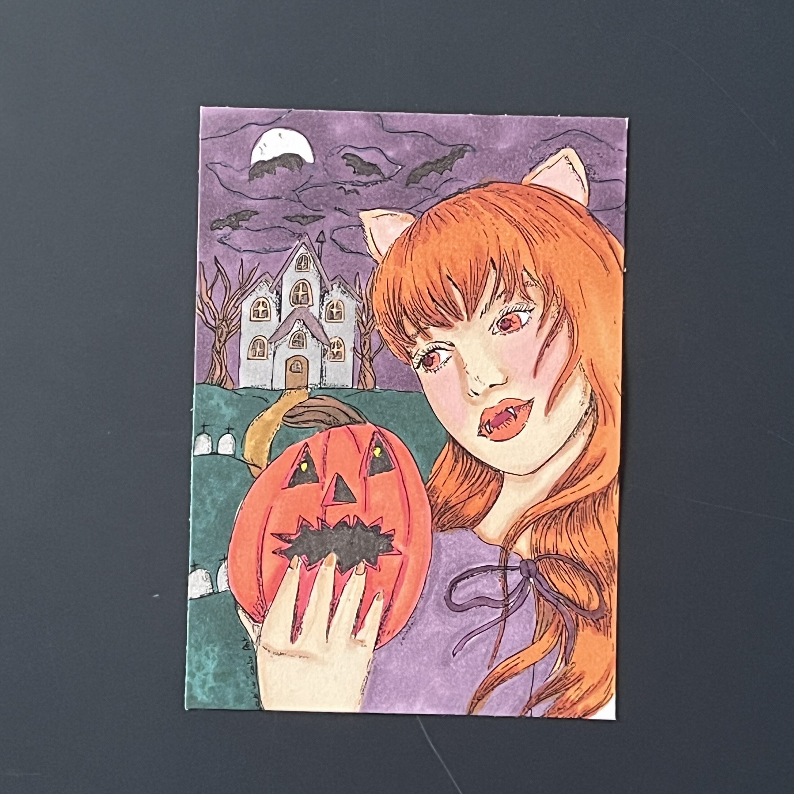 🎨 Un design original : dessin de Sab in color, une vampire avec un citrouille, feutres à alcool et stylos gel.