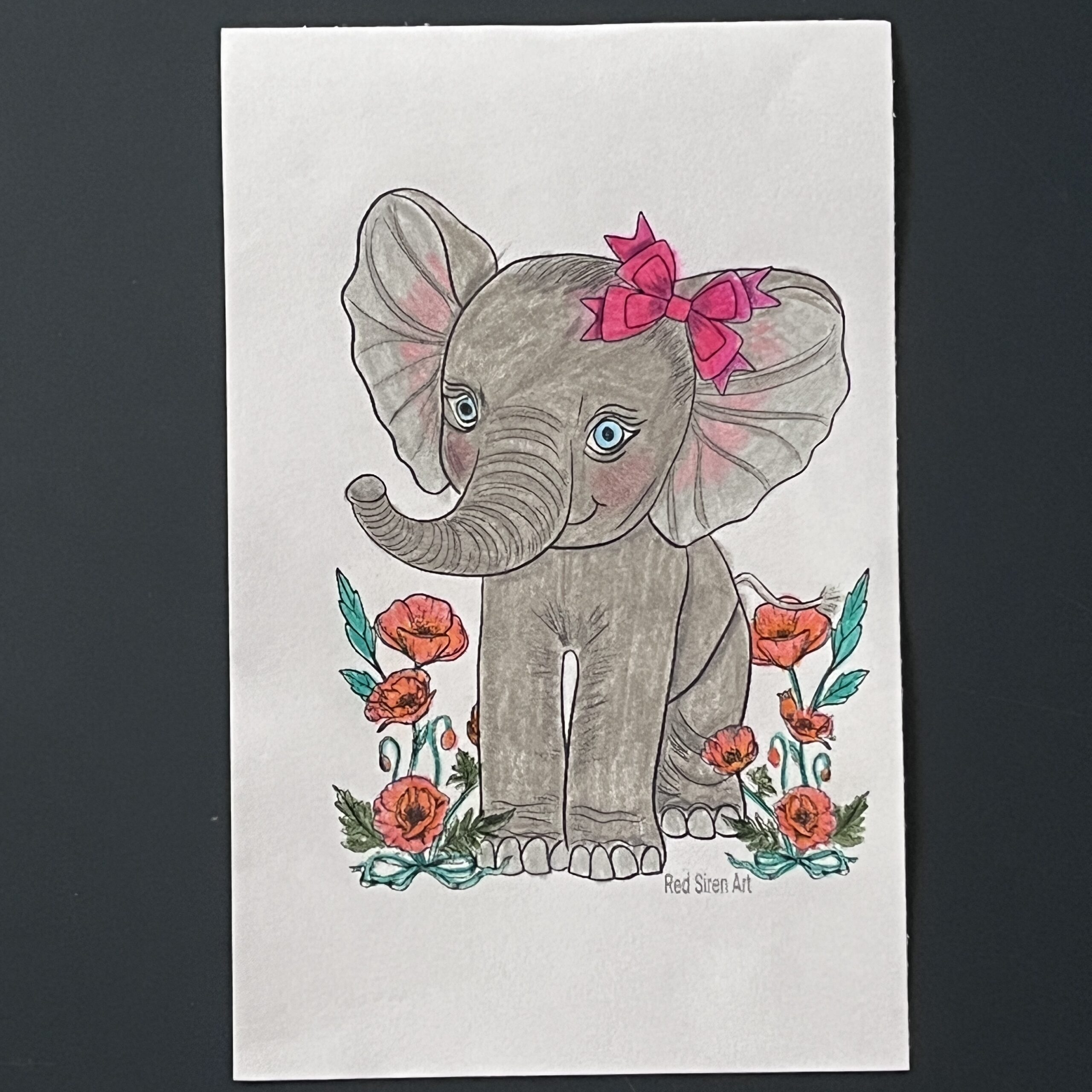 🎨 Un design original : dessin de Red siren art, un éléphant avec un nœud rose, crayons de couleur.