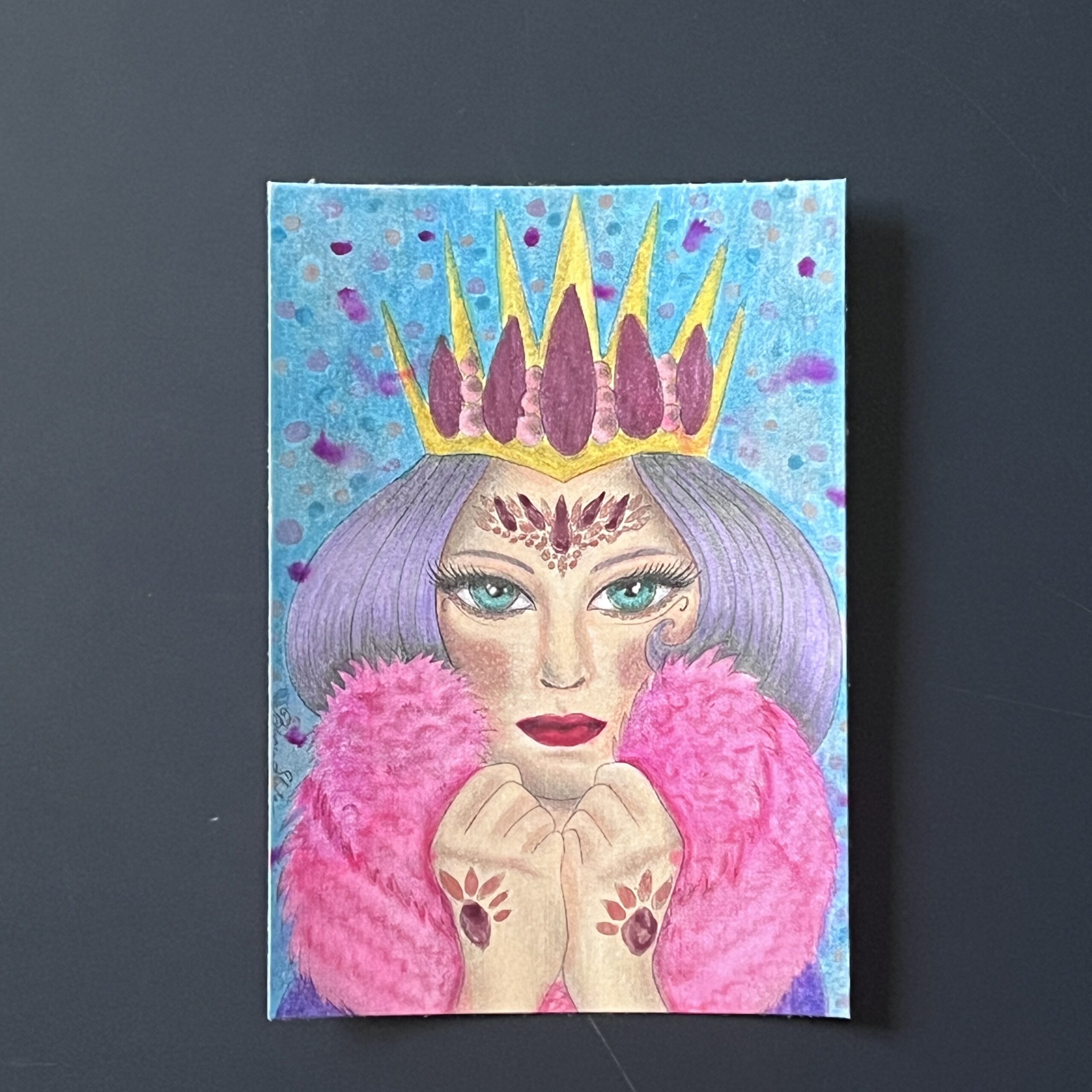 🎨 Un design original : dessin de Bianca State, le portrait d’une reine, feutres à alcool et feutres pailletés.