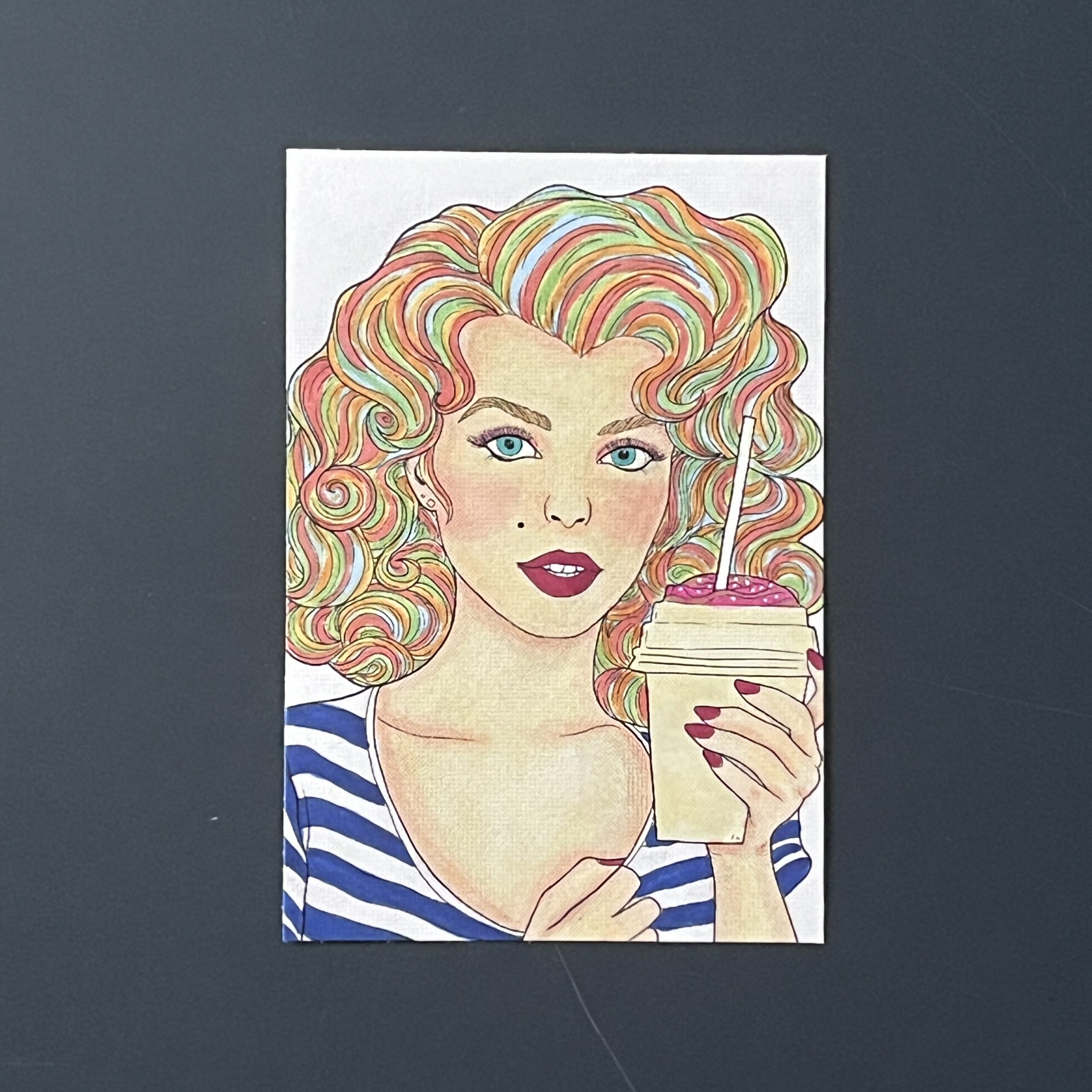 🎨 Un design original : dessin de Snickerdoodles, une femme buvant un smoothie, feutres à alcool.